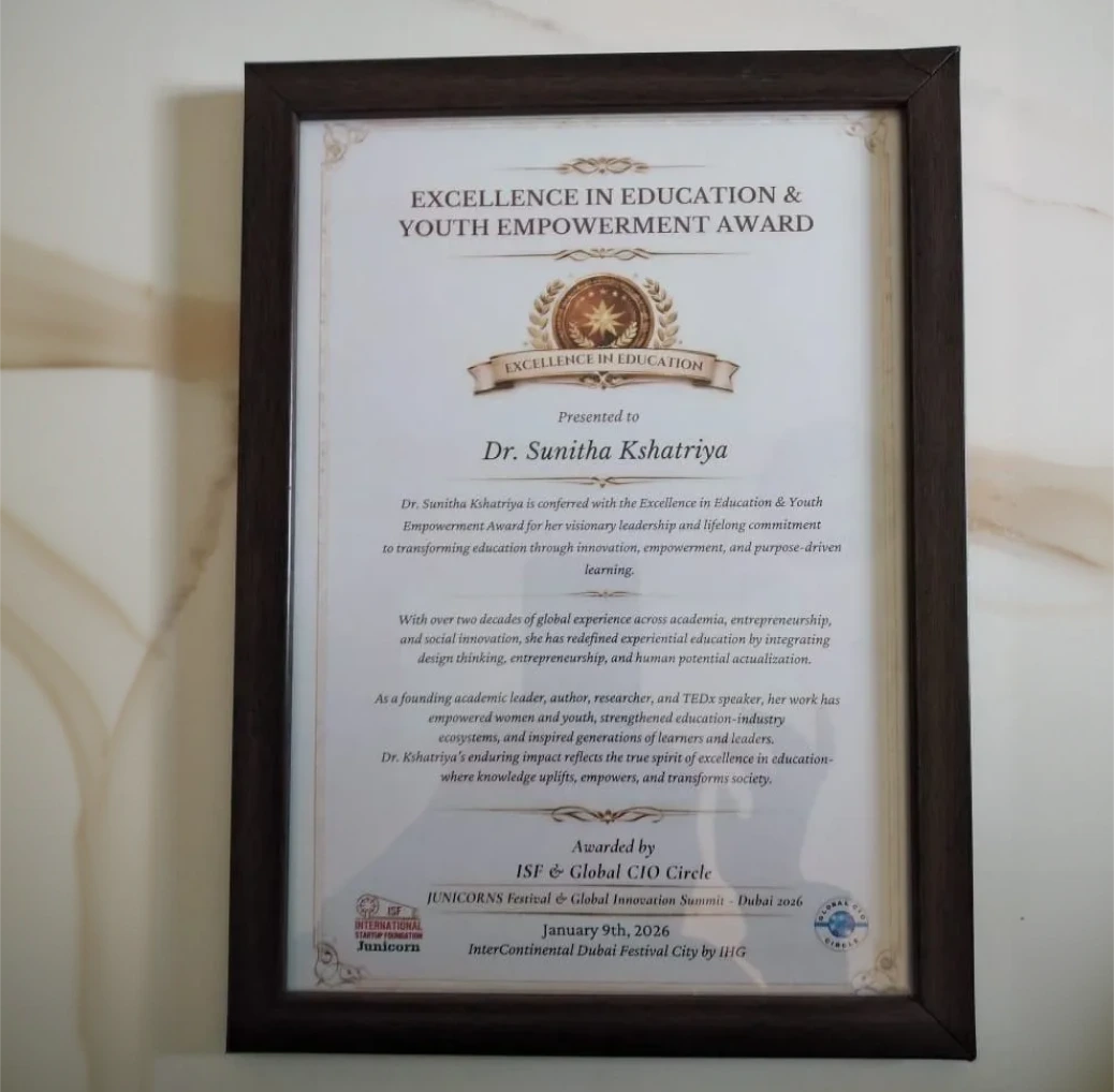 A self-motivated, action-oriented, and results-driven educator with doctoral qualifications, Dr. Sunitha Kshatriya specializes in Entrepreneurship and Innovation, Design Thinking, Strategic HR Management, program creation and development, curriculum design, quality assurance, and institutional assessment and accreditation. She brings over two decades of leadership experience across academia, entrepreneurship, and social innovation, with extensive international exposure across the UAE, Canada, India, and Saudi Arabia.